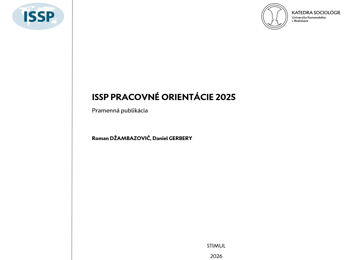 Pramenná publikácia prezentuje výsledky medzinárodného sociologického výskumu ISSP Pracovné orientácie 2025 na Slovensku. Text metodologicky ukotvuje program ISSP (Kapitola 1) a analyzuje postoje k zamestnaniu, pracovným podmienkam a zlaďovaniu pracovného a osobného života (Kapitola 3). Ťažiskom je transformácia práce v digitálnom veku a reflexia obáv obyvateľstva z robotizácie a umelej inteligencie. Napriek pretrvávajúcej priorite istoty zamestnania pociťuje viac ako polovica verejnosti obavy zo straty pracovných miest v dôsledku technologického pokroku. Postoje k digitalizácii a prístup k flexibilným formám práce sú stratifikované predovšetkým na základe dosiahnutého vzdelania a veku. Analýza diferencuje zistenia pre celú populáciu, pracujúcich a nepracujúcich respondentov, pričom interpretácia sa opiera o detailný prehľad sociálno-demografických znakov skúmaného súboru a ich domácností (Kapitola 4).